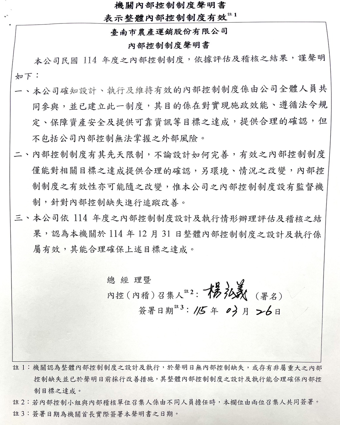 【臺南市農產運銷股份有限公司】 114年度內部控制制度聲明書